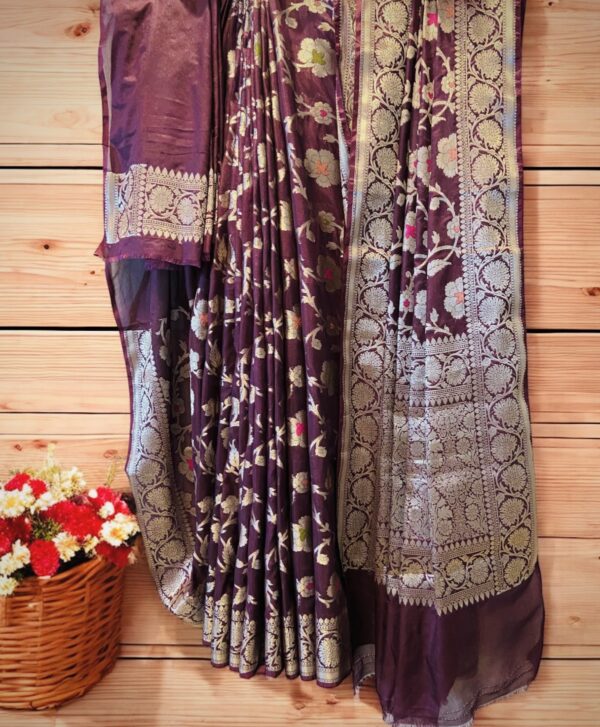 Exquisite wine-colored semi khaddi georgette saree adorned with intricate meenakari floral motifs and luxurious silver zari borders, perfect for making a royal statement at any special occasion.