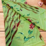 Lime green hand-painted pure chiffon saree with floral and wavy stripe motifs—lightweight, airy, and perfect for adding a fresh artistic touch to any occasion.