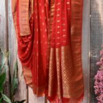 Immerse yourself in the heritage of Varanasi with this Red Pure Chinon Banarasi saree, adorned with traditional Golden Zari Butta motifs that embody centuries of royal craftsmanship. Each delicate butta is meticulously woven using pure gold threads, creating lustrous patterns that shimmer with every movement and symbolize prosperity and prestige. The feather-light chinon fabric ensures effortless draping while maintaining the regal essence of authentic Banarasi artistry. These golden zari butta designs represent the pinnacle of Indian textile tradition, where skilled artisans transform precious metallic threads into intricate floral and geometric motifs. Perfect for weddings, festivals, and ceremonial occasions, this masterpiece celebrates the opulent legacy of Mughal-era craftsmanship while offering modern comfort. The rich red hue paired with golden zari creates an auspicious combination that has adorned royalty for generations, making this saree a treasured heirloom piece.”