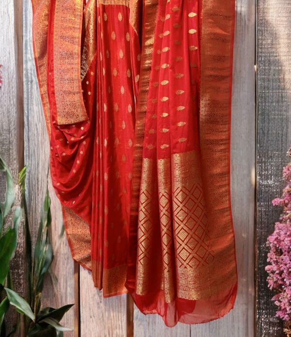 Red Pure Chinon Banarasi Saree with Golden Zari Butta Work