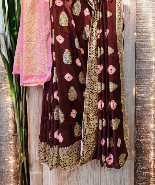 Shine in our Viscose Georgette Bandhej saree—where soft, flowy fabric meets traditional tie-dye art in vibrant, elegant style