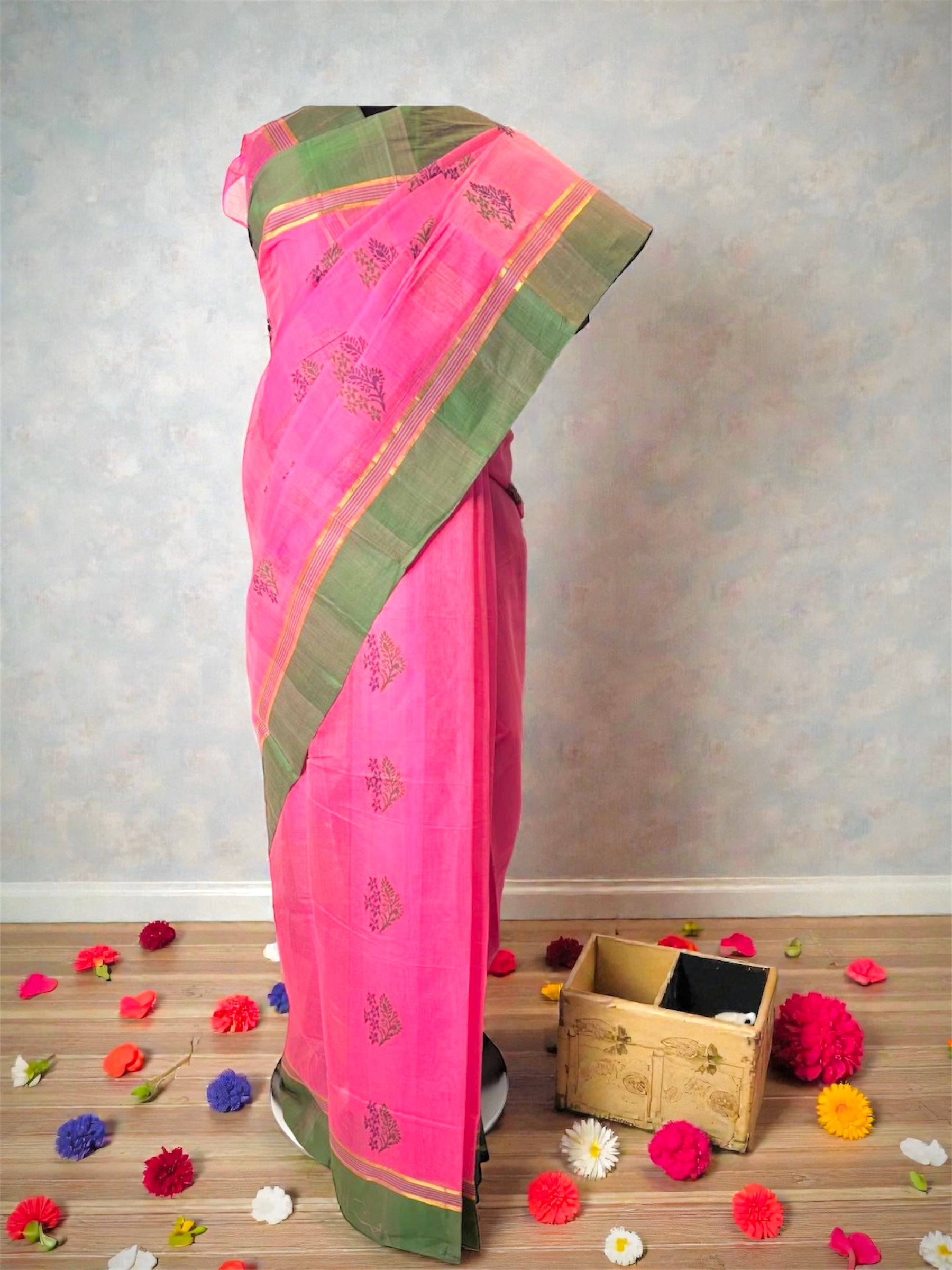 • Iron on reverse at low heat; avoid perfumes near zari areas.