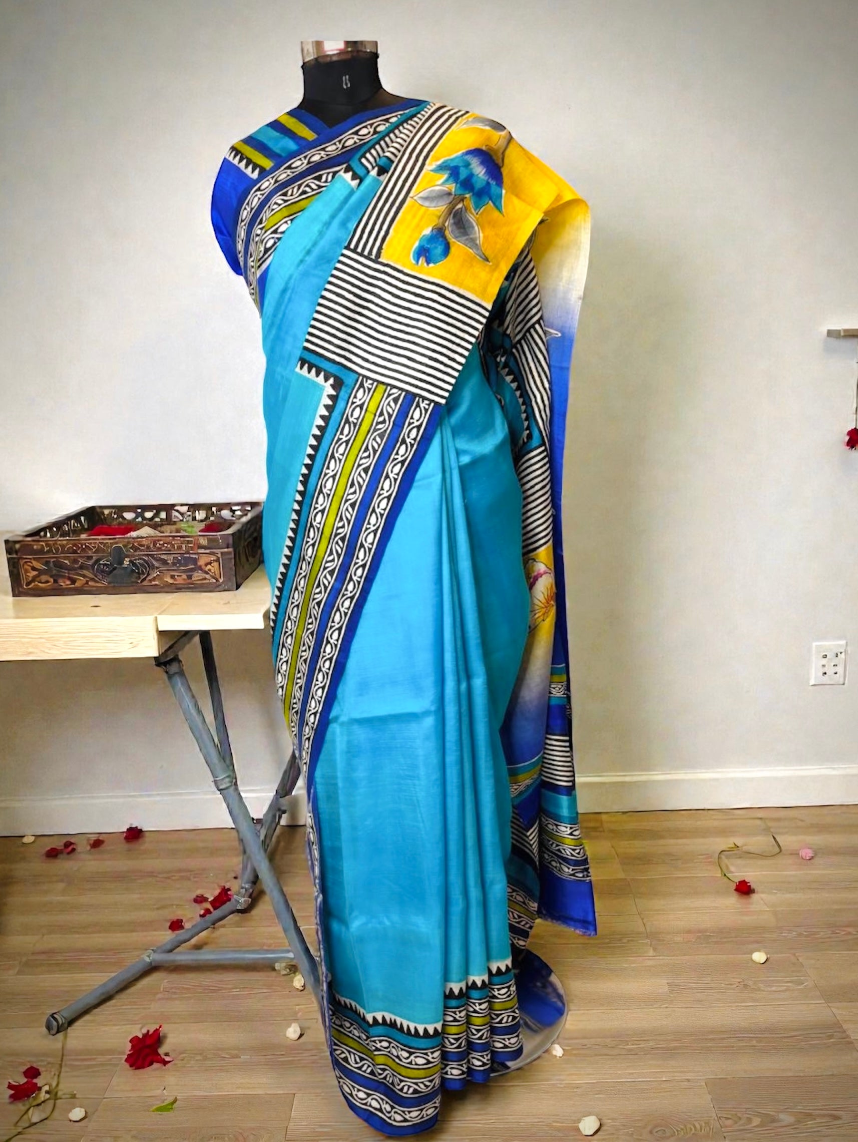 This Blue Pure Handwoven Bishnupuri Silk Saree brings together art and elegance in one fluid drape. The body features a serene blue base, while the pallu and borders are highlighted with bold stripes, geometric patterns, and painterly floral panels in yellow, black, and royal blue for a contemporary hand‑painted look. Lightweight yet lustrous, Bishnupuri silk makes this saree perfect for cultural events, gatherings, or days when you want your saree to be the conversation starter. The attached blouse piece carries the same design language, allowing you to create a cohesive, gallery‑worthy