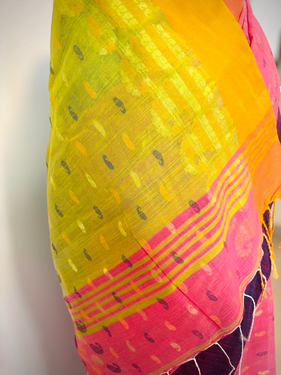 • Unique variations in motif placement, weave density, and texture are the hallmark of authentic handwoven Jamdani and make each saree irreplaceable.